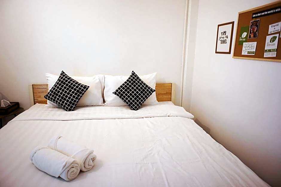 This room type is located on the 4th floor next to the shared bathroom. It does not have a window. The unit offer 1 bed, Queen size with air-conditioned includes a TV with streaming services and a shared bathroom.